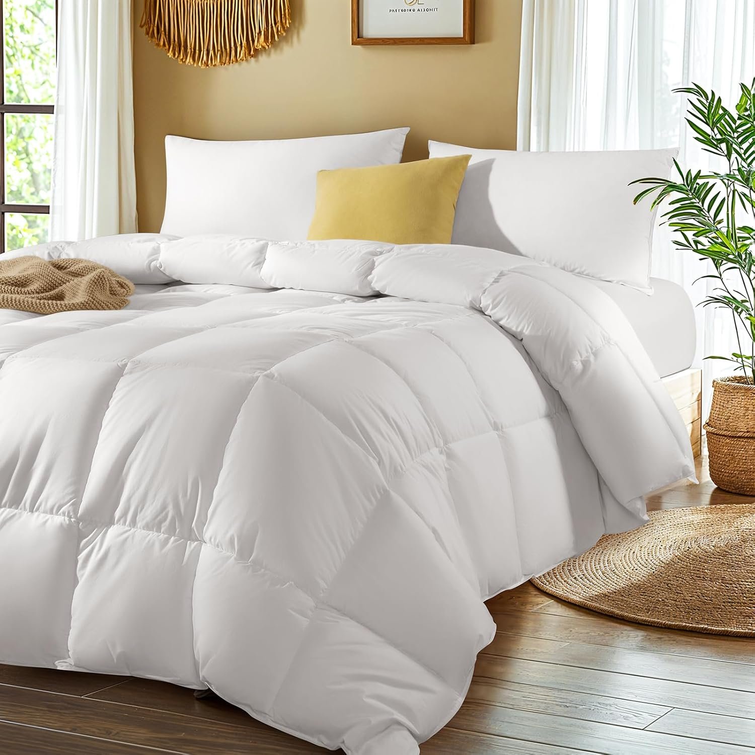 - All-Season Versatility: Whether it’s the depths of winter or the peak of summer, our duvet is designed for all-season comfort. It provides just the right amount of warmth to keep you cozy during cold nights, while remaining cool and breathable when temperatures rise. Measuring 106” x 90”, this king-size duvet fits perfectly on your bed, offering versatile year-round comfort and style